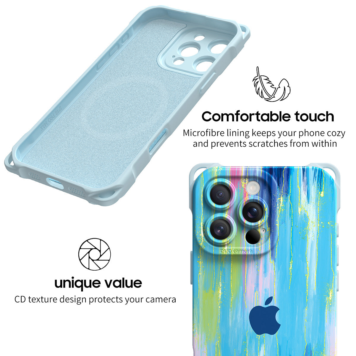 Achieving integrated protection for mobile phone cameras. The hole position of the camera is designed with CD texture, which has a visual impact and looks more beautiful.Microfibre lining keeps your phone cozy and prevents scratches from within.