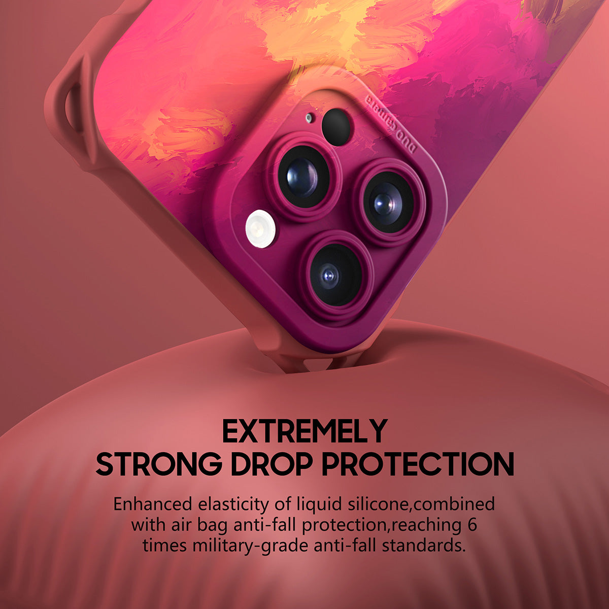 Enhanced elasticity of liquid silicone, combined with airbag anti-drop protection, effectively passed the 6.5-meter drop test and reached 6 times the military-grade drop protection standard.