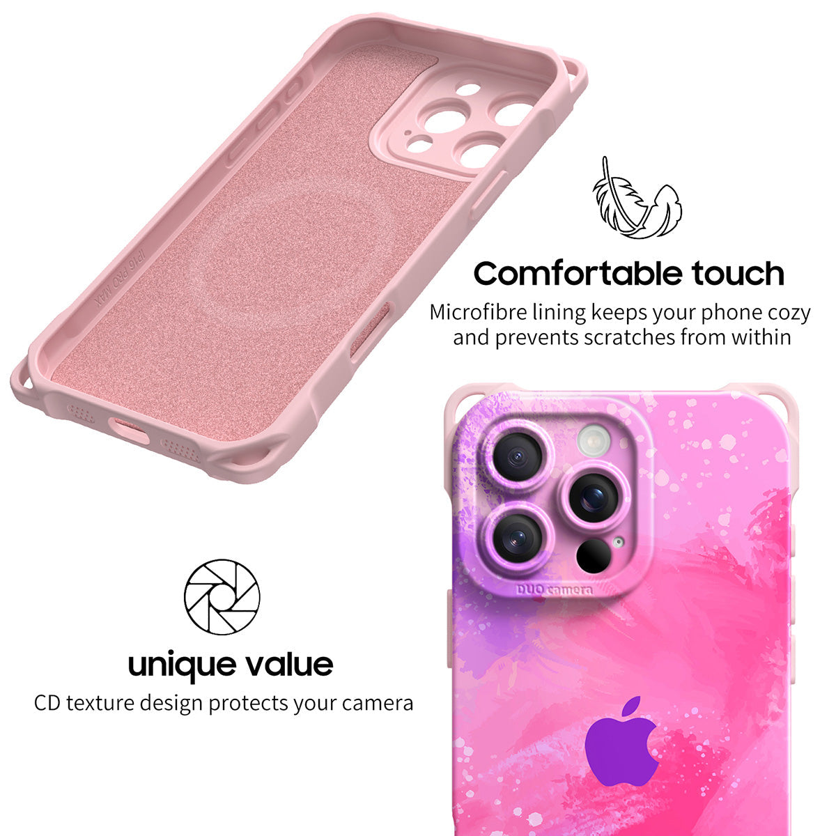 Achieving integrated protection for mobile phone cameras. The hole position of the camera is designed with CD texture, which has a visual impact and looks more beautiful.Microfibre lining keeps your phone cozy and prevents scratches from within.