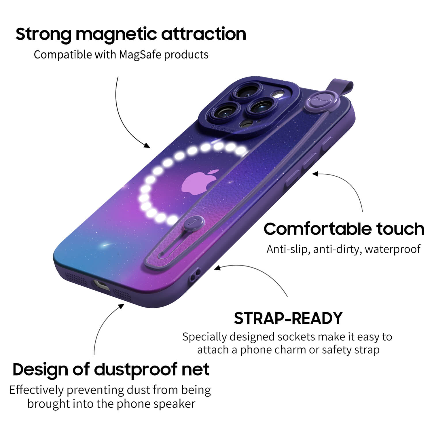 Built In Super Strong MagSafe Core, Enhances Adsorption, Not Easy To Fall Off. Comfortable Texture. Built In Dustproof Holes. Effectively Isolate Dust.